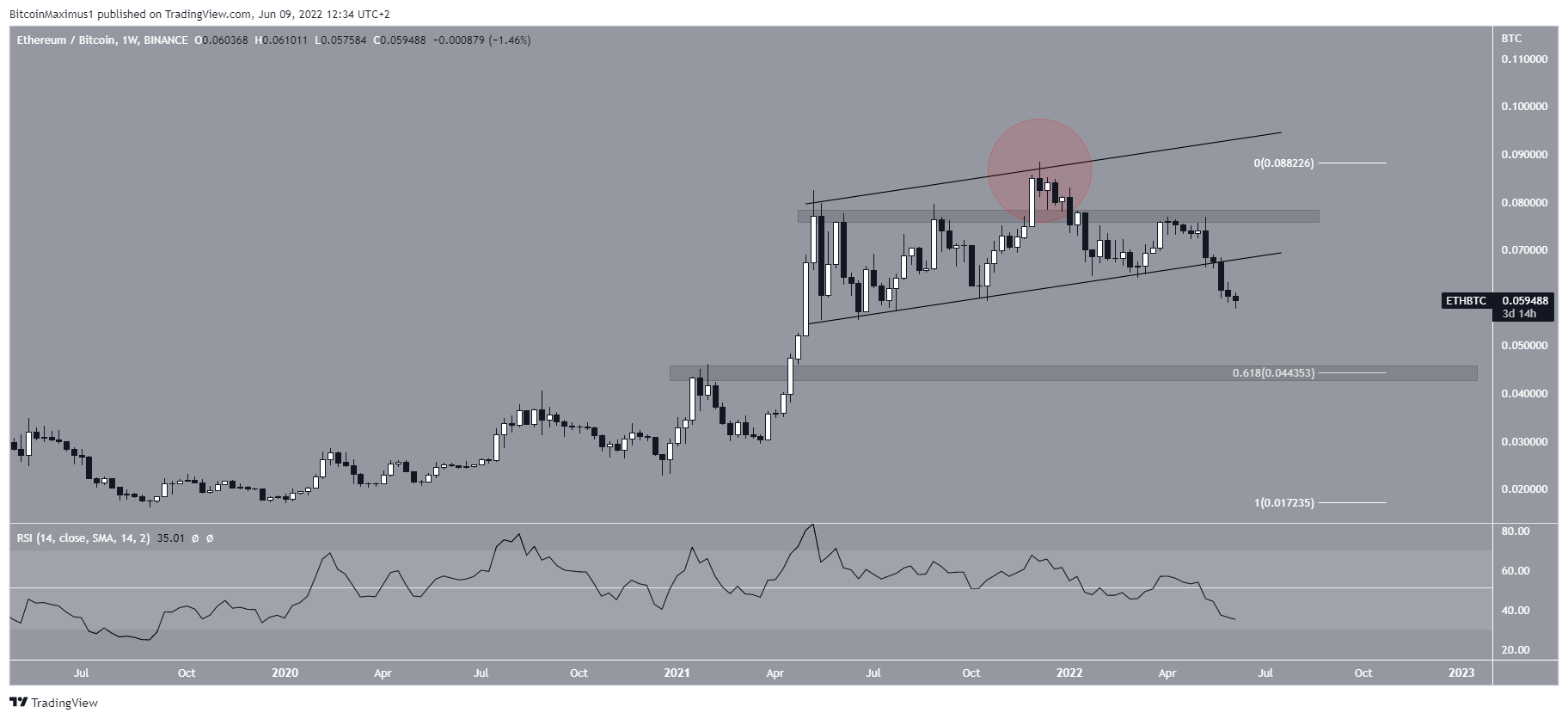 Biểu đồ hàng tuần có vẻ giảm, hỗ trợ những phát hiện từ biểu đồ BTCD hàng tuần. Sau khi lệch trên vùng kháng cự ₿0.0765, ETH đã phá vỡ khỏi một kênh song song tăng dần trong dài hạn. Sau đó, chỉ báo RSI đã di chuyển xuống dưới 50, cung cấp một dấu hiệu khác của xu hướng giảm.