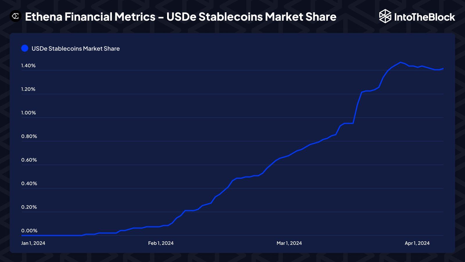 Với mức APY +10% khi người dùng stake USDe tạo sức hấp dẫn cho nhà đầu tư. Vốn hóa của USDe ngày càng tăng mạnh từ đầu năm đến nay đã vượt 2.3 tỷ USD, IntoTheBlock cho biết tỷ trọng USDe đã tăng từ 0% đến hơn 1.4%. Biểu đồ cho thấy vốn hóa và tỷ trọng USDe tăng tốc từ tháng 2 và đang có dấu hiệu đi ngang trong tháng 4.