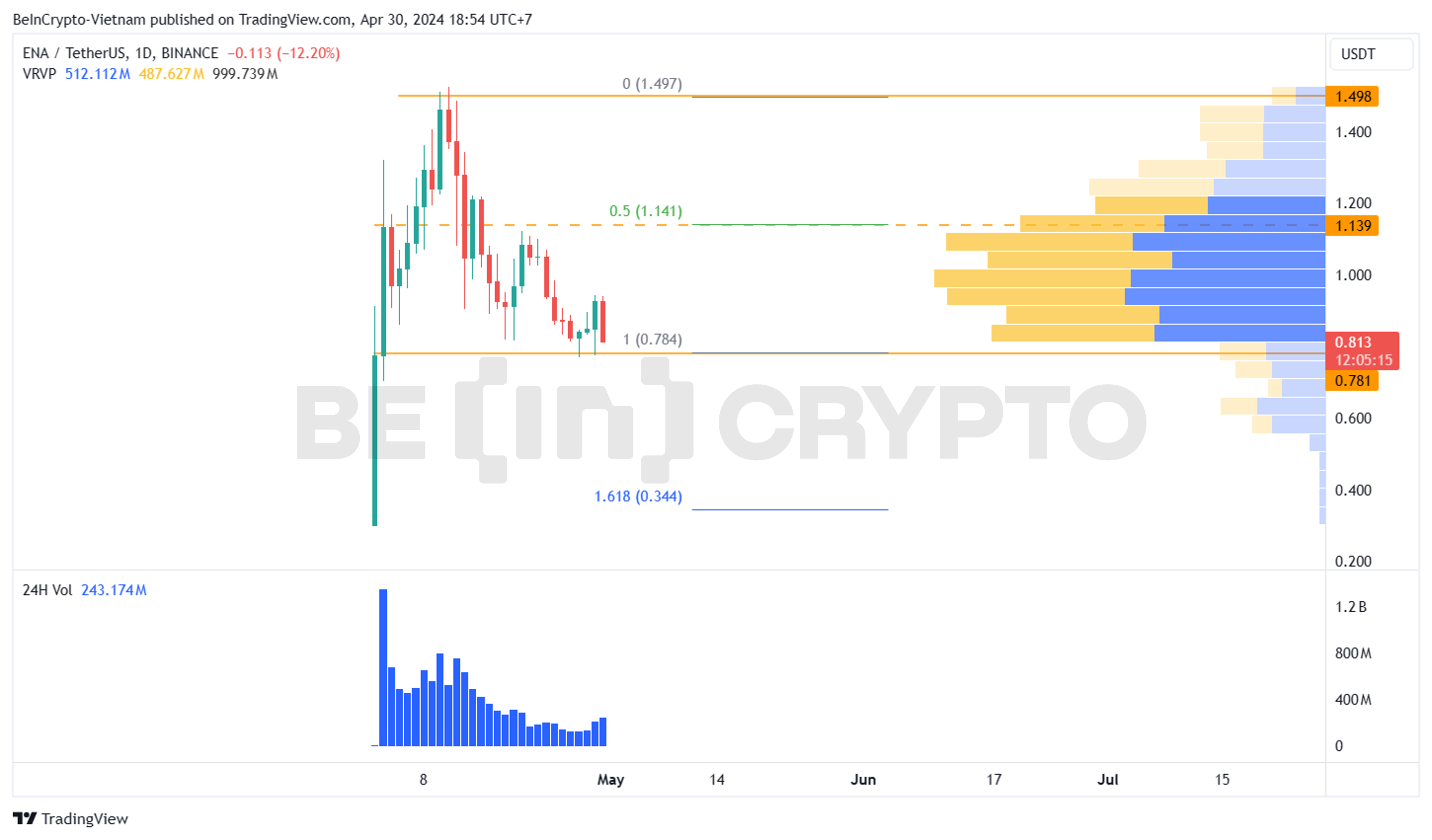 Về mặt kỹ thuật đường giá, cấu trúc giá ENA liên tục tạo mức thấp dần trong khung 12h, và càng về sau càng cho khả năng phục hồi kém hơn tại hỗ trợ 0.78 USD. Khối lượng có tăng nhẹ nhưng vẫn chưa đủ mạnh để vực dậy đường giá. Nếu hỗ trợ 0.78 USD bị phá vỡ, ENA có thể giảm đến 0.35 USD – 0.4 USD tương đương với fibonacci 0.618.