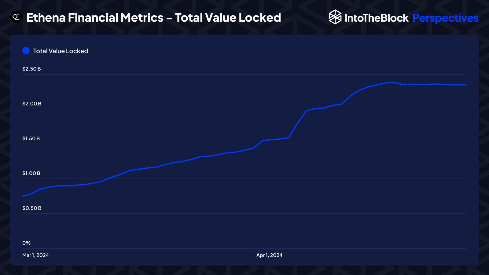 Tổng giá trị khóa trong của Ethena đã tăng từ dưới 1 tỷ USD lên gần 2.5 tỷ USD trong hai tháng gần đây. Điều này cho thấy sự thu hút dòng vốn chảy vào đáng ghi nhận đối với giao thức này. Tuy nhiên, TVL đã có dấu hiệu chững lại trong tháng 4 và có khuynh hướng giảm nhẹ.