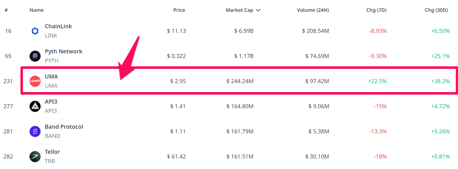 UMA đang là token dẫn đầu đà phục hồi trong hệ Oracle trong 7 ngày gần đây với mức tăng hơn 22%, và đồng thời dẫn đầu đà tăng tháng qua với mức tăng hơn 38%.