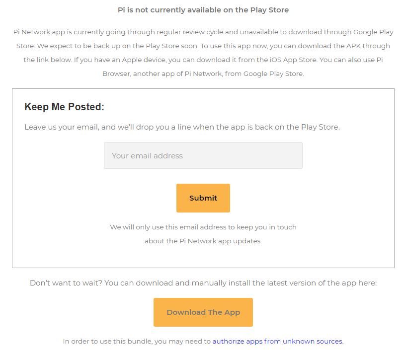 Mới đây, nếu truy cập trang chính thức của Pi Network sẽ thấy thông báo không thể tải ứng dụng này trực tiếp từ Play Store. Và nếu bạn tìm kiếm Pi Network trên Play Store cũng sẽ không tìm thấy ứng dụng đào Pi nữa.