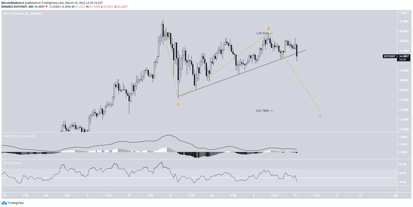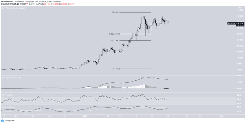Sau khi ghi nhận mức ATH mới là 48.2 USD vào 20 tháng 2, DOT đã giảm.