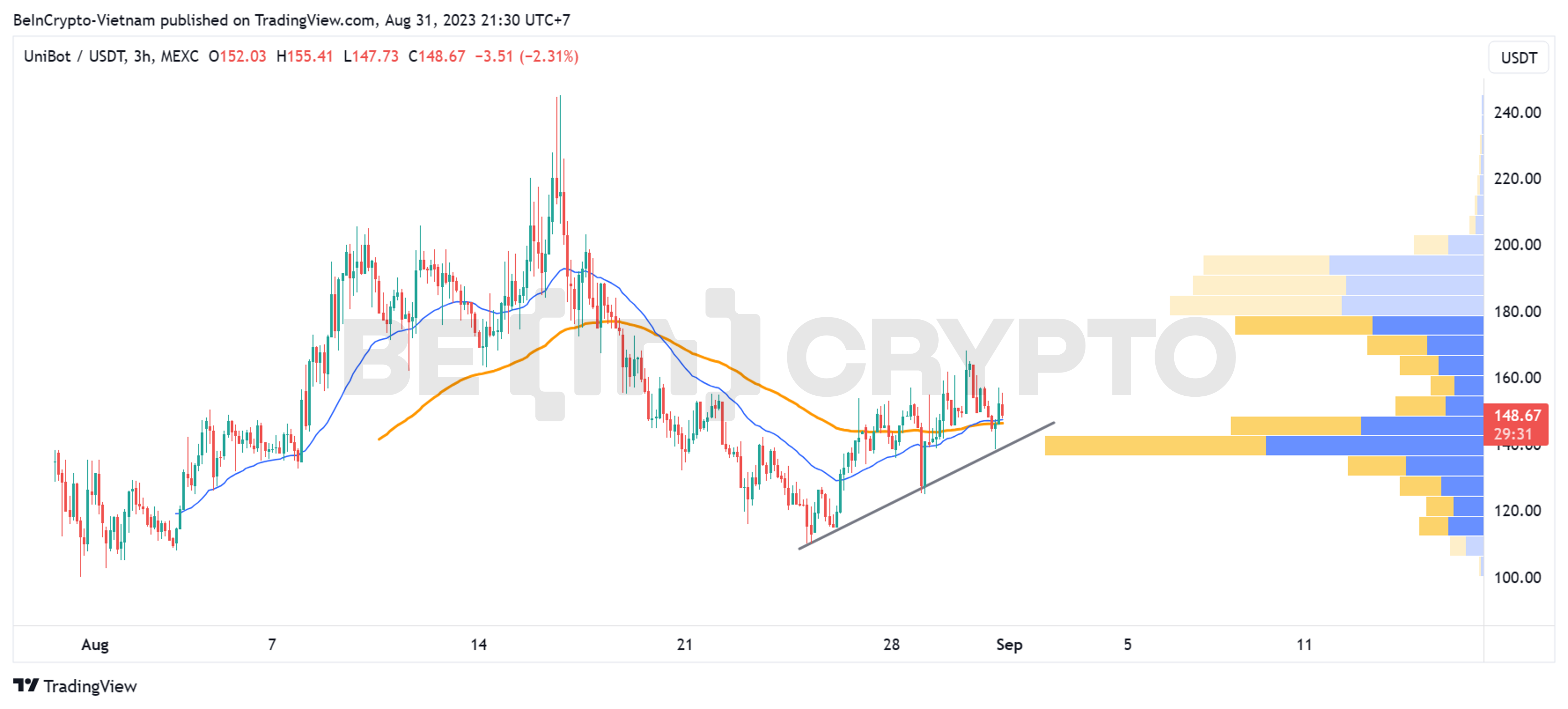 Giá Unibot hiện đang được giao dịch ở mức 148 USD. Đây là mức giá ghi nhận sự phục hồi 50% kể từ đáy, nhưng đã giảm 40% kể từ đỉnh. Dữ liệu giá của Unibot còn quá ít ỏi để phân tích. Nhưng có thể nhận thấy Unibot đã thiết lập vùng cầu ở 100 USD – 110 USD, và hỗ trợ gần hiện tại là vùng 140 USD.