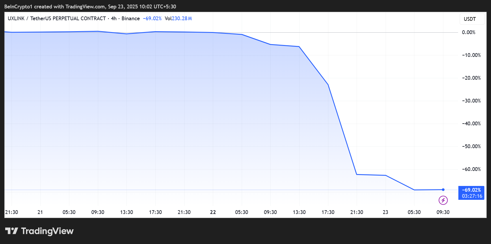 Tại thời điểm viết bài, giá token UXLINK giảm gần 70% xuống còn 0.09404 USD, một tâm lý tiêu cực do vụ tấn công vào ứng dụng mạng xã hội gần đây.