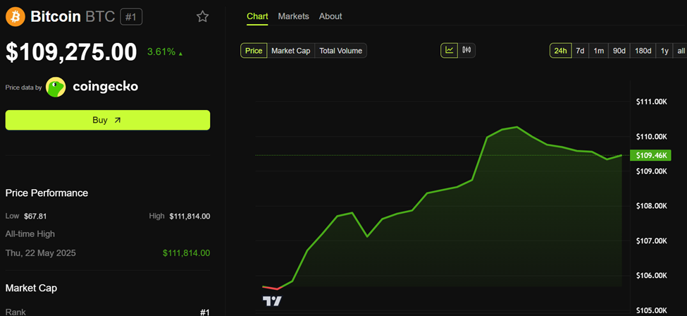 Dữ liệu từ BeInCrypto cho thấy Bitcoin đã tăng gần 4% trong 24 giờ qua và đang tiến gần đến ngưỡng 110,000 USD. Tại thời điểm viết bài, BTC đang giao dịch ở mức 109,275 USD, tiến gần đến ATH 111,814 USD được ghi nhận vào ngày 22/05/2025.