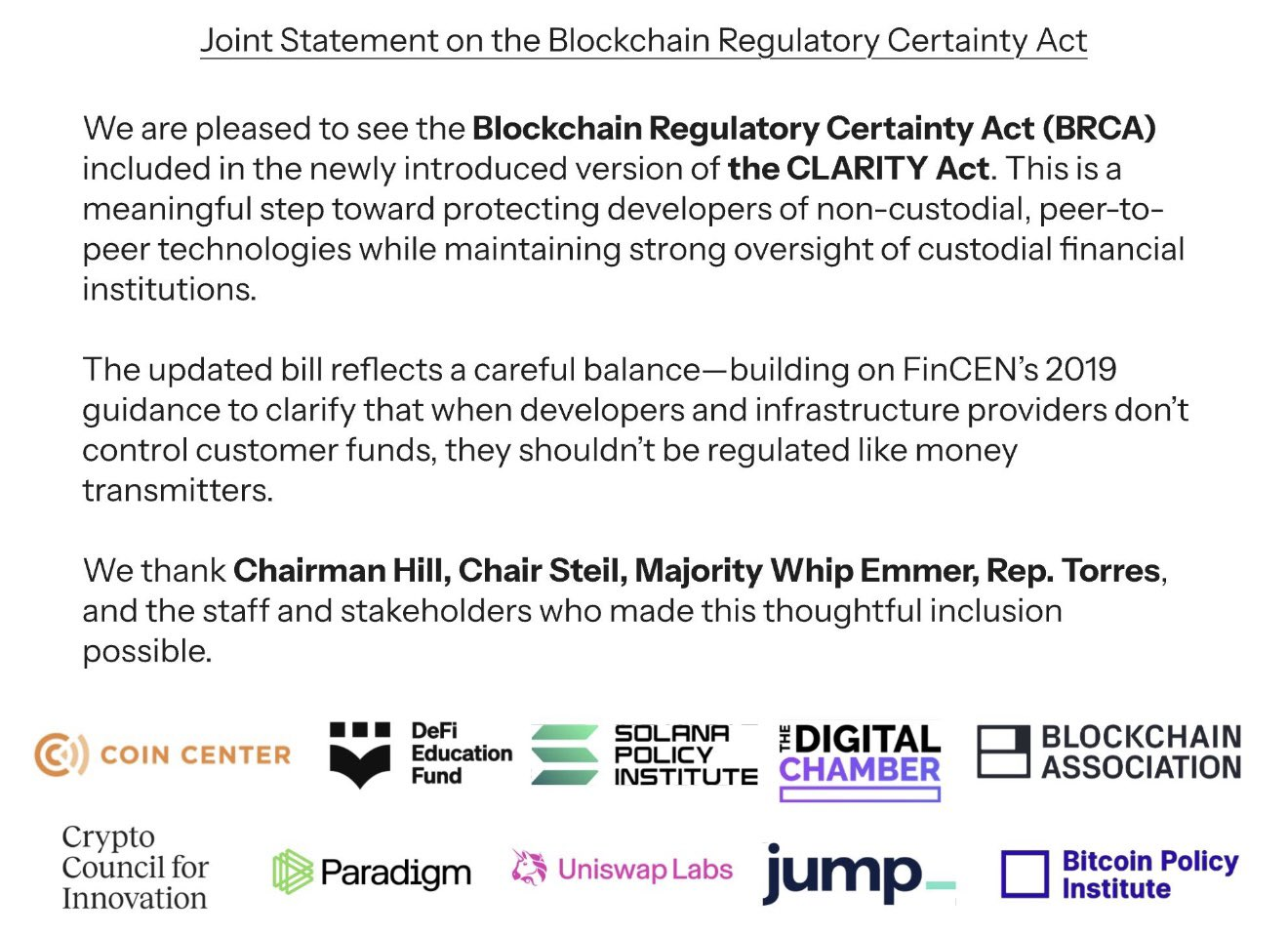 Mặc dù được đề xuất bởi một đảng viên Cộng hòa, Đạo luật CLARITY nhận được sự ủng hộ mạnh mẽ từ cả hai đảng, phản ánh mong muốn tạo ra một khung pháp lý vững chắc cho việc điều chỉnh tiền điện tử.