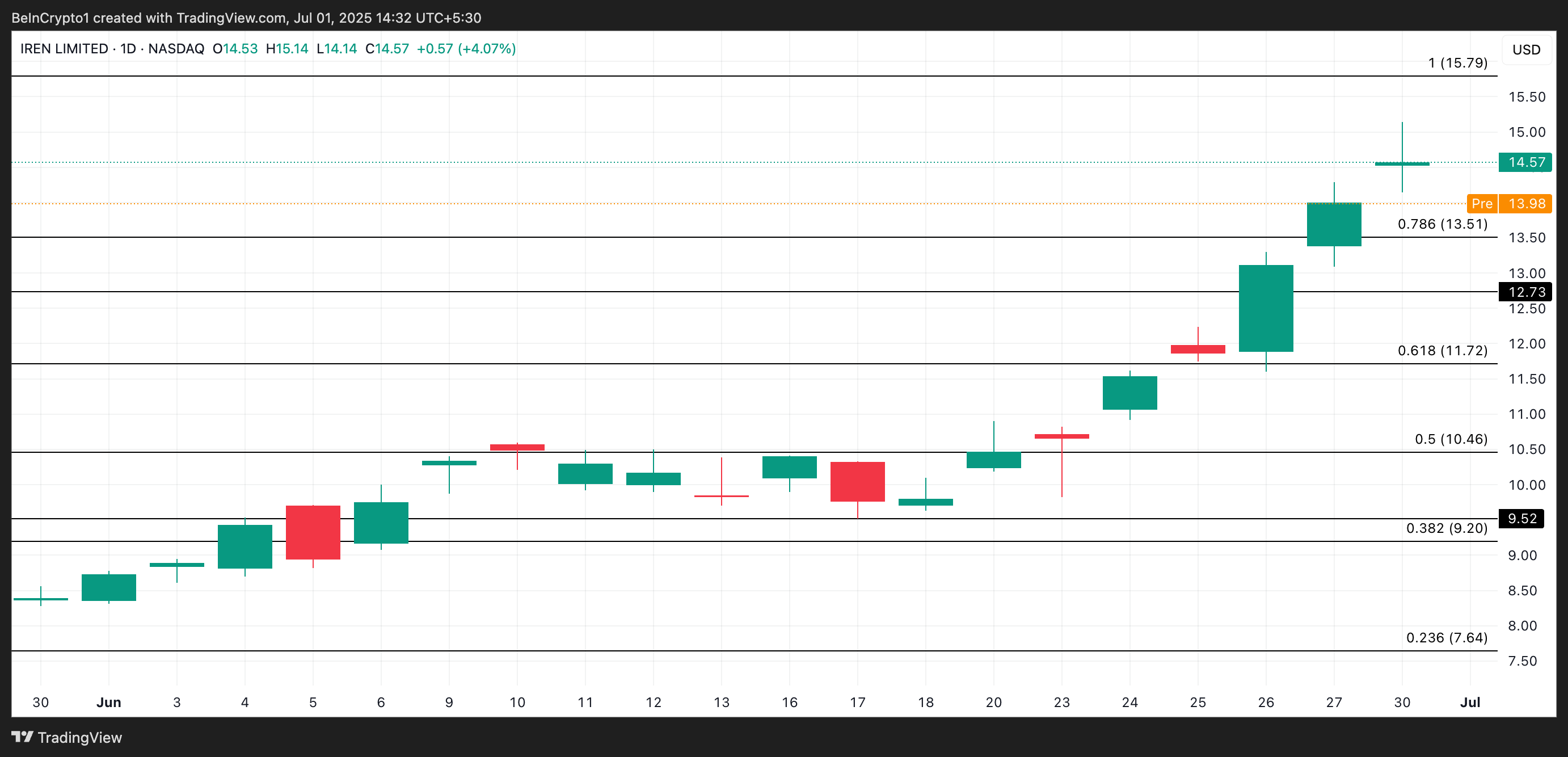 Trong phiên giao dịch trước giờ mở cửa hôm nay, IREN có giá 13.98 USD. Nếu phe mua vẫn kiểm soát khi thị trường mở cửa, cổ phiếu có thể tăng lên mức 15.79 USD.