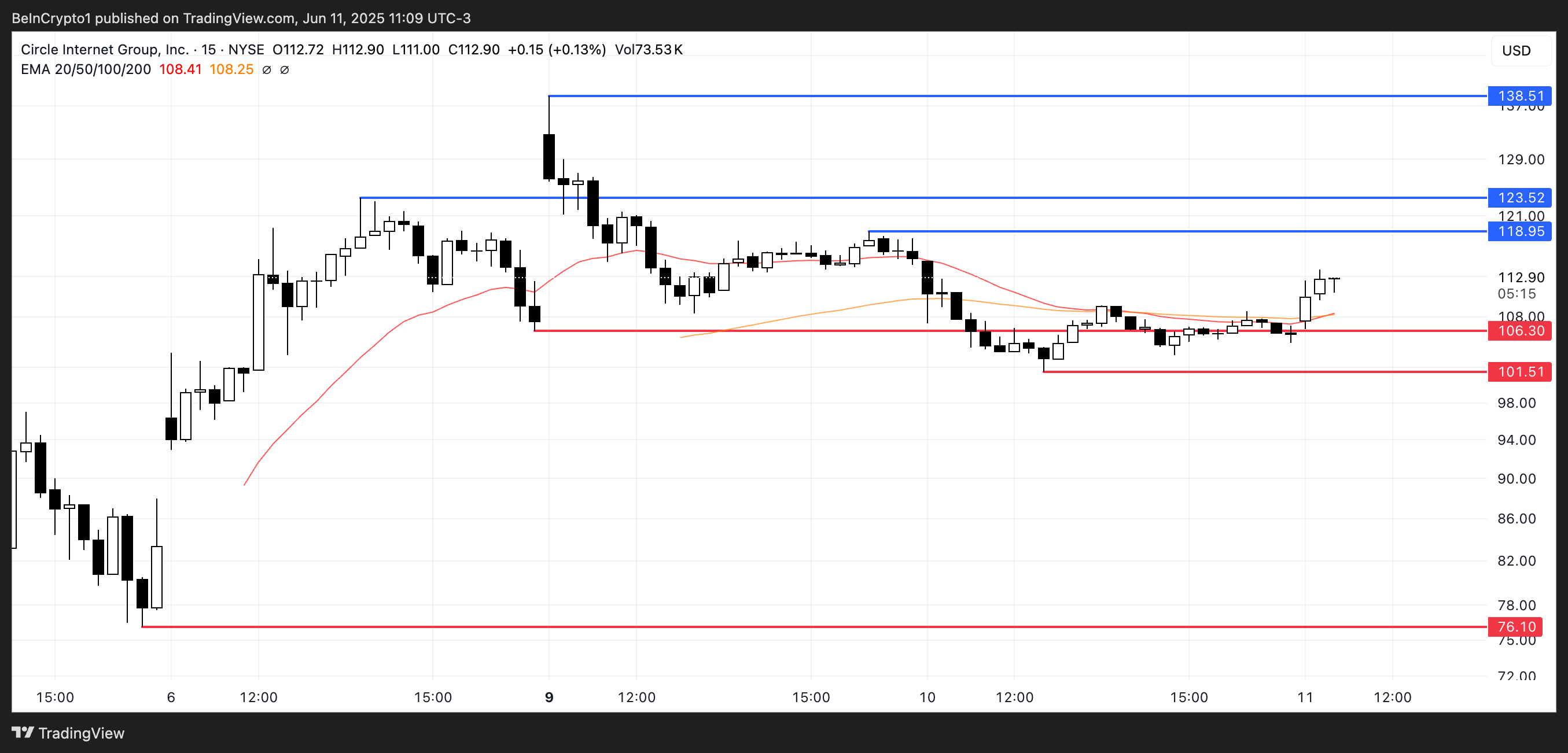 Nếu đà tăng tiếp tục, CRCL có thể kiểm tra mức kháng cự tại 118 USD và 123 USD và có khả năng leo lên 138 USD. Tuy nhiên, nếu không giữ được hỗ trợ tại 106 USD hoặc 101 USD, rủi ro giảm có thể kéo nó trở lại phạm vi 76 USD.