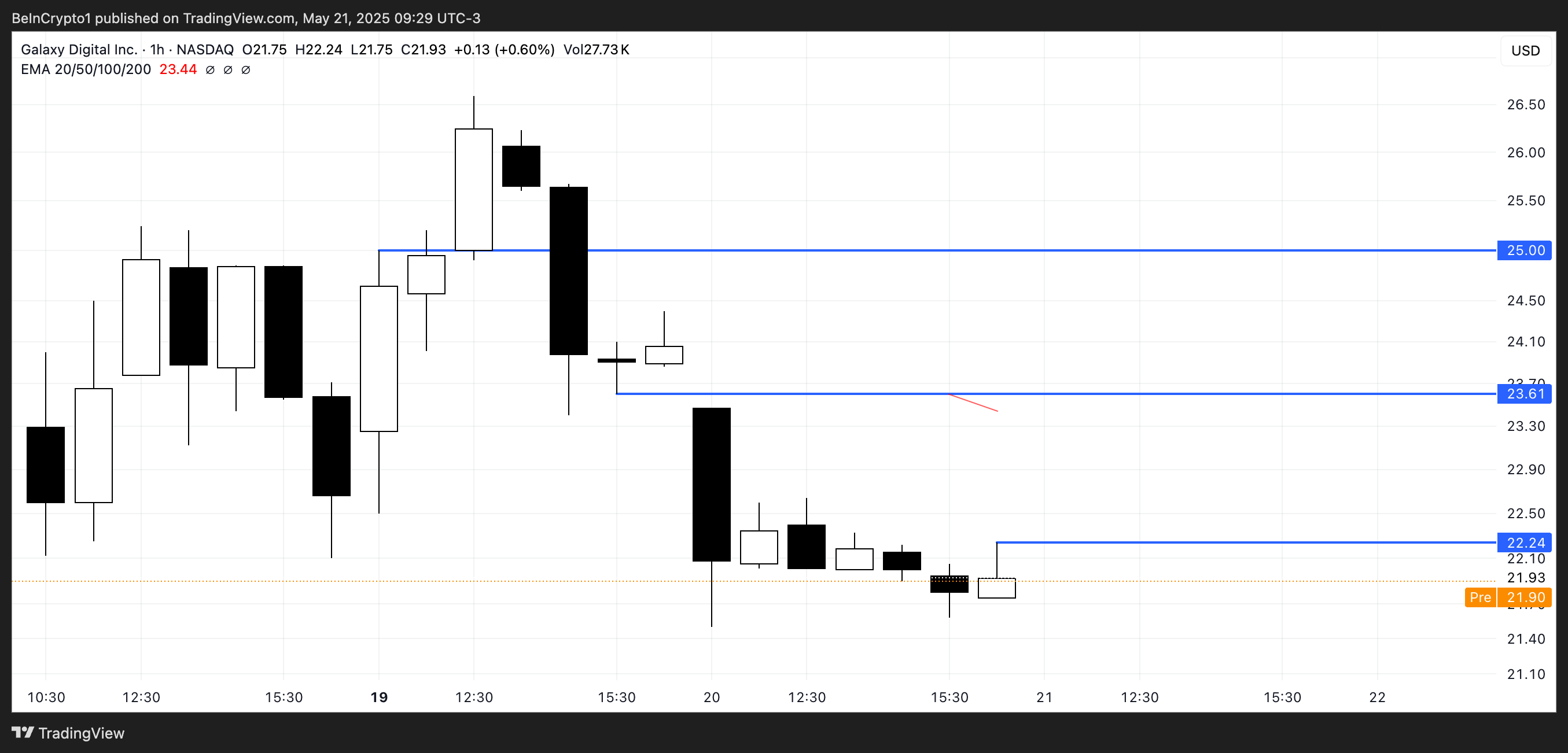 Galaxy Digital (GLXY) đóng cửa hôm qua với mức giảm mạnh 7.36% nhưng đang cho thấy sự phục hồi nhẹ trong giao dịch trước giờ mở cửa, tăng 1.5%. Công ty đã ra mắt trên Nasdaq vào ngày 16/05, mở cửa ở mức 23.50 USD mỗi cổ phiếu.