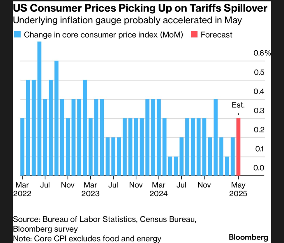 Khảo sát của Bloomberg cho thấy lạm phát có thể đã tăng vọt trong tháng 5 giữa hỗn loạn thuế quan ở Mỹ. Cụ thể, khảo sát cho thấy một sự tăng vọt lên 0.3% cho Core CPI sau 0.2% trong tháng 4.