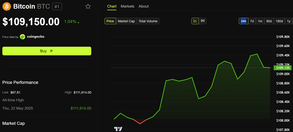Trong khi đó, với những tín hiệu kinh tế Mỹ đang chờ đợi, Bitcoin đang giao dịch ở mức 109,150 USD tại thời điểm viết bài, tăng hơn 1% trong 24 giờ qua.