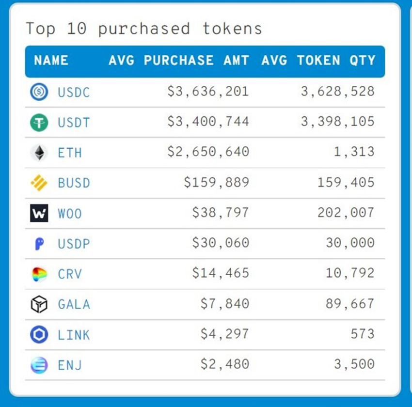 Ngoài ra, các tài sản kỹ thuật số khác như Tether, Binance US Dollar (BUSD), WOO Network (WOO), USDP, Curve (CRV), Gala (GALA), Chainlink (LINK) và Enjin (ENJ) là một trong những loại tiền điện tử được mua nhiều tiếp theo bởi 100 địa chỉ ví cá voi hàng đầu này.