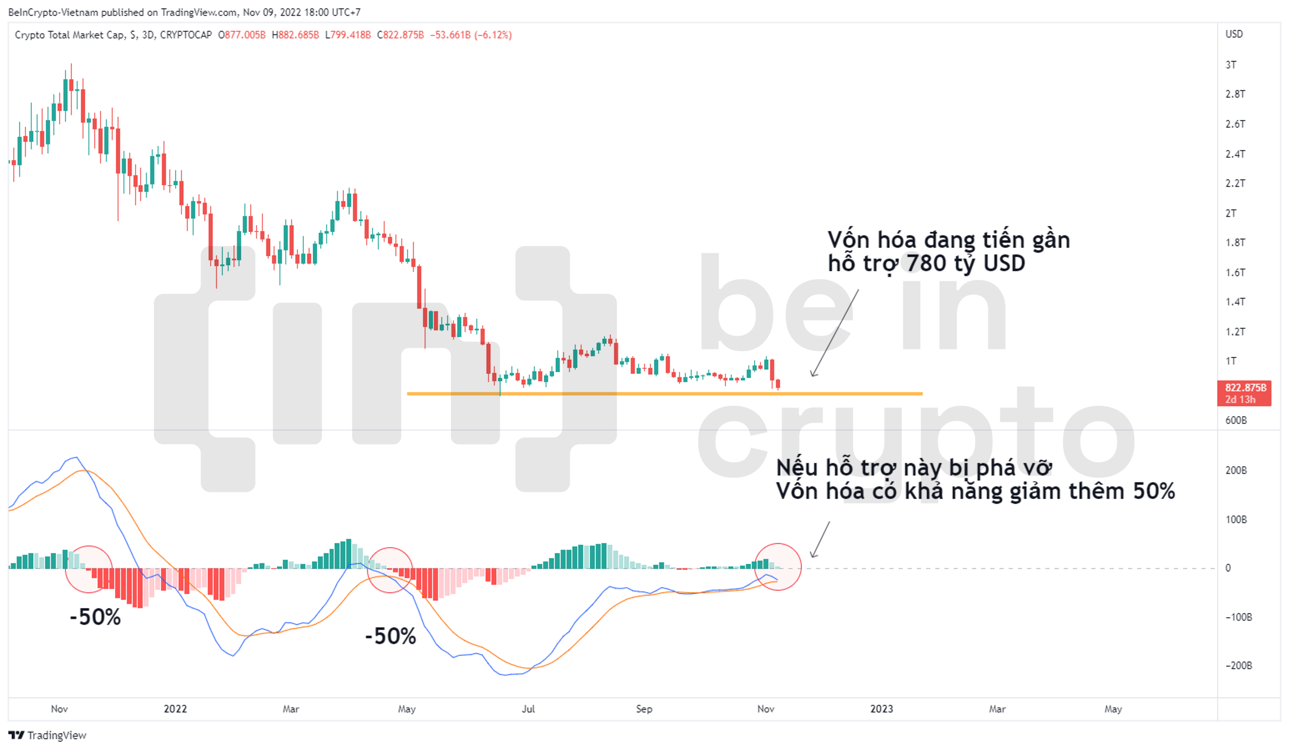 - Vùng 780 tỷ đô đang là hỗ trợ mạnh. Thời điểm bài viết, vốn hóa hiện đang ở mức 820 tỷ USD. Nếu hỗ trợ mạnh này bị phá vỡ, một giao cắt xấu từ chỉ báo MACD-H sẽ được xác nhận.