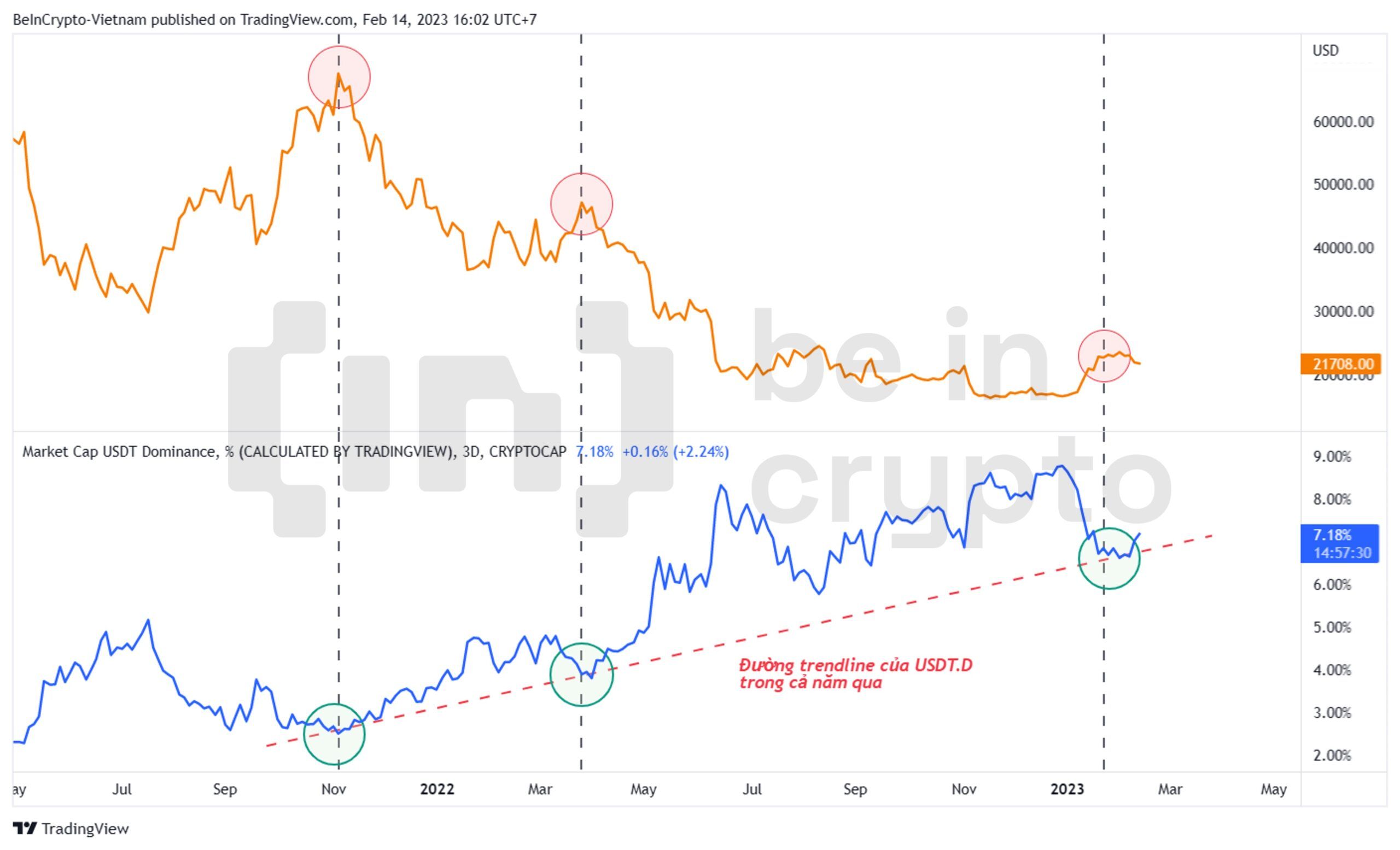 - Chúng ta vừa chứng kiến tín hiệu như vậy trong tháng 2 này. USDT.D chạm vùng 6.5% tại trendline ngay khi giá BTC chạm mức 24,000 USD. Hiện tại, USDT.D đã tăng vượt mức 7% trong khi giá BTC đóng nến tuần dưới 22,000 USD.