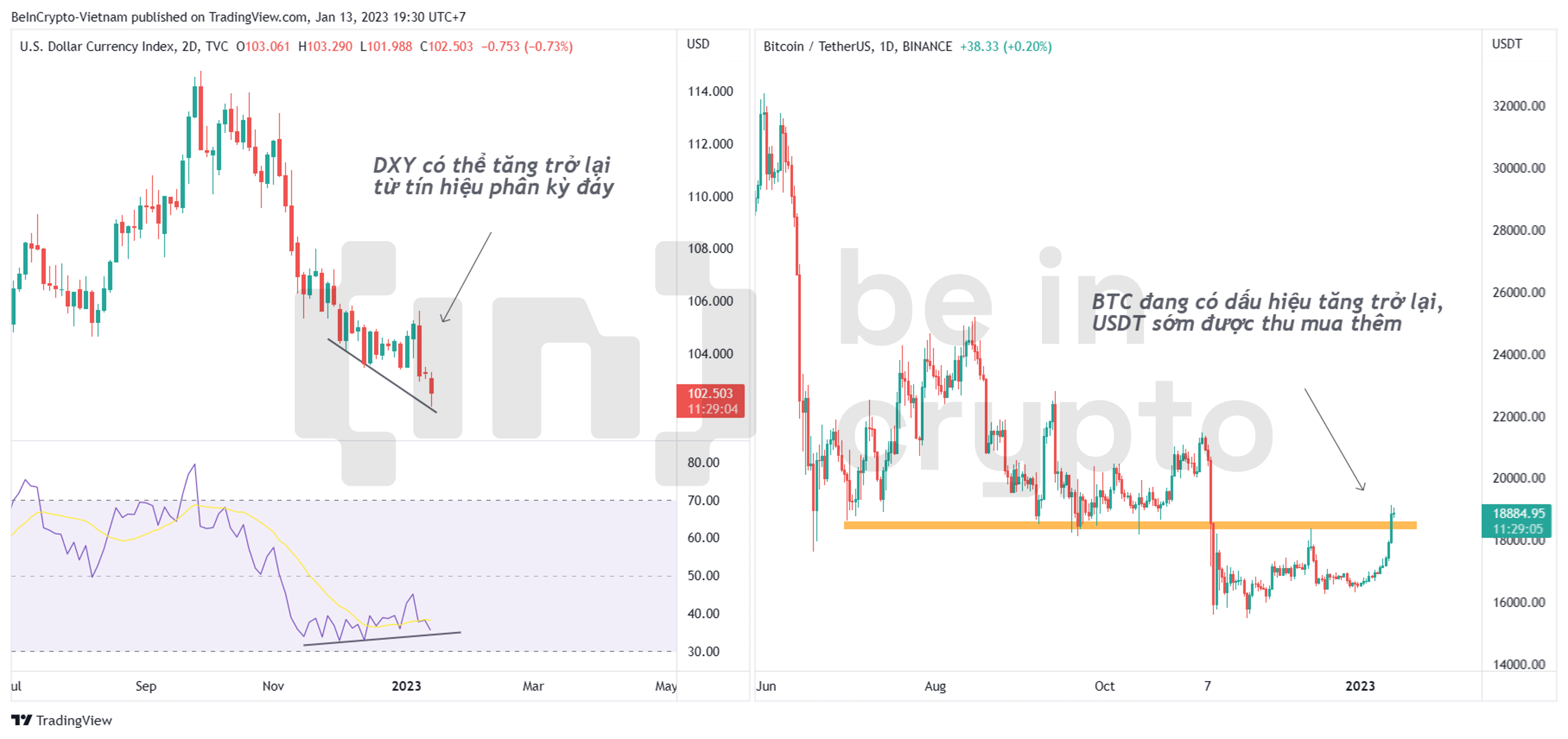 - Thứ hai, DXY đang ở mức thấp nhất kể từ tháng 6/2022 cho đến nay. Đà điều chỉnh này đang tạo nên một tín hiệu phân kỳ đáy dự báo sự phục hồi. Khi giá đô tăng trở lại, thì có thể USDT/VND cũng sẽ tăng theo.