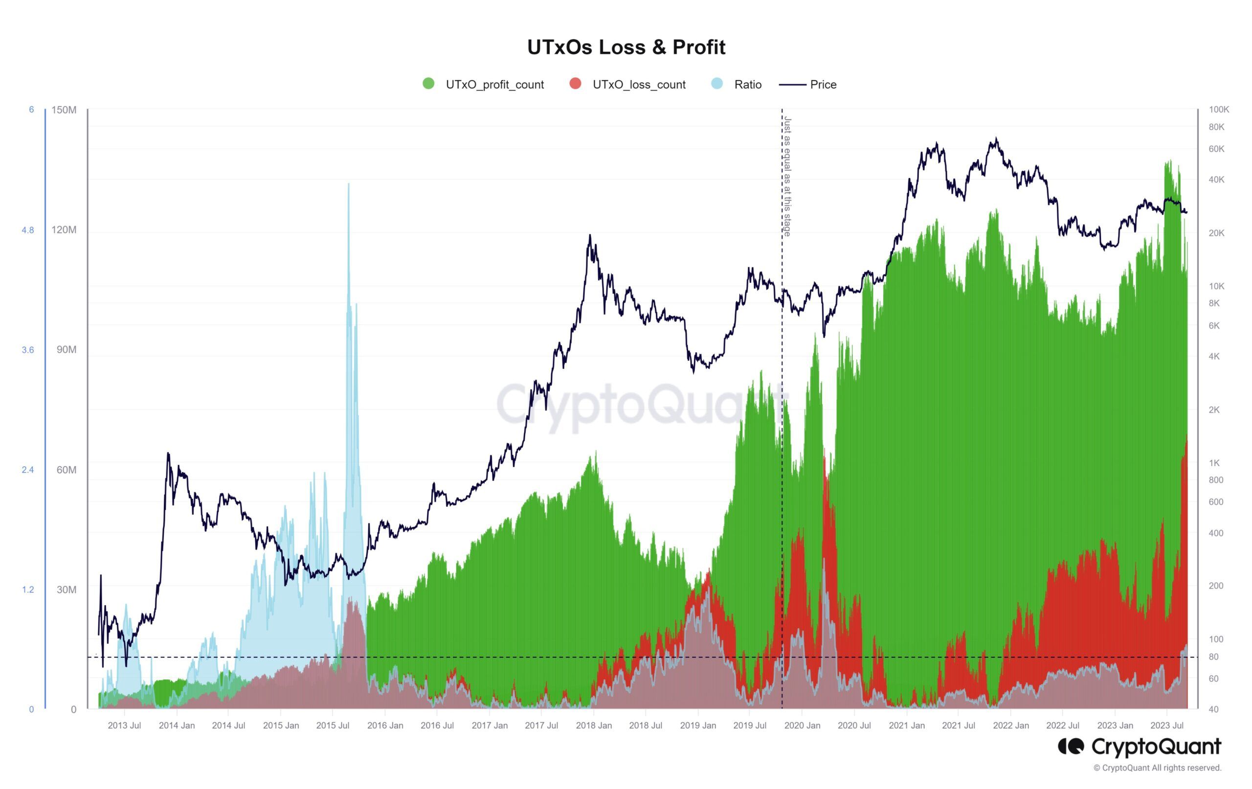 Sẽ rất phiến diện nếu đánh giá tình trạng hiệu suất của nhà đầu tư Bitcoin chỉ bằng dữ liệu UTXOs thua lỗ. Biểu đồ sau sẽ giúp đánh giá khách quan hơn bằng cách bổ sung quan sát lượng UTXOs có lợi nhuận, và tỷ lệ giữa lượng UTXOs thua lỗ trên UTXOs có lợi nhuận.