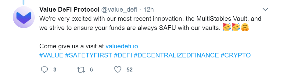 Trước đó, cách vụ tấn công này chưa lâu, Value DeFi còn đang rất tự hào về độ an toàn của mình.