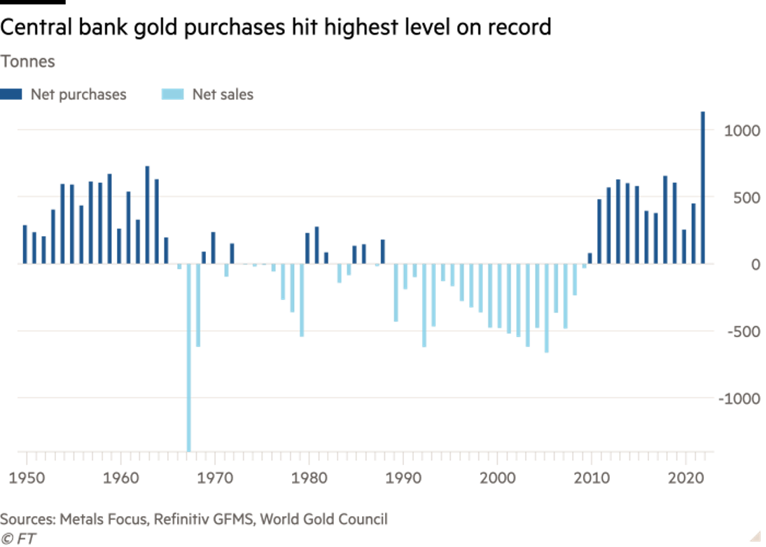 Nhìn vào biểu đồ dưới đây, dữ liệu cho thấy trong 10 năm trở lại đây, Net Purchase luôn dương. Và đặt biệt nhất là năm 2022 vừa qua, Net Purchases thiết lập mức cao nhất kể từ sau thế chiến thứ 2 cho đến nay. Nghĩa là lượng vàng các ngân hàng trung ương mua vào áp đảo lượng vàng bán ra.
