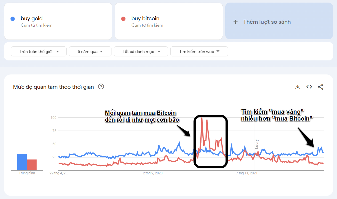 - Mối quan tâm mua vàng có xu hướng vượt trội hơn Bitcoin trong đa phần thời gian. Đặc biệt đầu năm 2023 này, khoảng cách giữa hai mối quan tâm trên cách xa nhau. Tâm lý quan tâm mua Bitcoin giảm mạnh và tâm lý tìm mua vàng lại tăng.