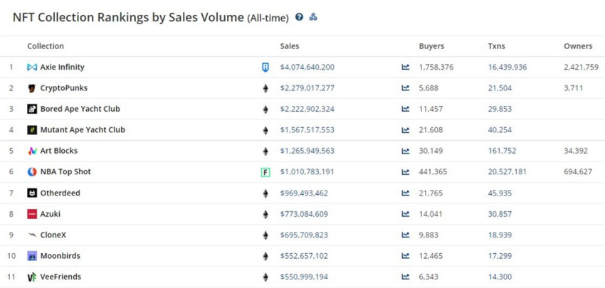 Các bộ sưu tập kỹ thuật số khác đang được chạy quảng cáo với số lượng bán ra nhiều nhất bao gồm Moonbirds, CloneX, Azuki, Otherdeeds, NBA Top Shot, Art Blocks, Mutant Ape Yacht Club (MAYC), Bored Ape Yacht Club (BAYC), CryptoPunks, và Axie Infinity.