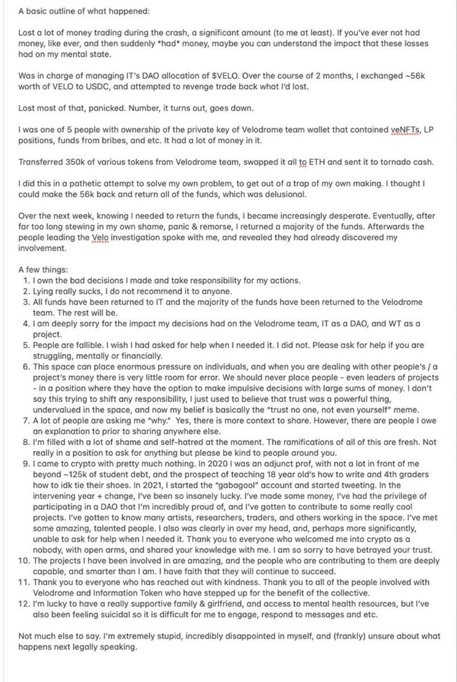 Theo báo cáo ngày 14/8, Velodrome phát hiện một trong những quỹ trả lương đã bị đánh cắp 350,000 USD. Sau đó, Velodrome đã thực hiện một cuộc điều tra nội bộ và đã thu hồi lại tài sản bị chiếm dụng. Đáng tiếc thay, kẻ đánh cắp là một thành viên của cộng đồng lập trình nổi tiếng có liên quan đến Velodrome, Gabagool.eth. Trong báo cáo, Velodrome chia sẻ sau sự cố rằng:
