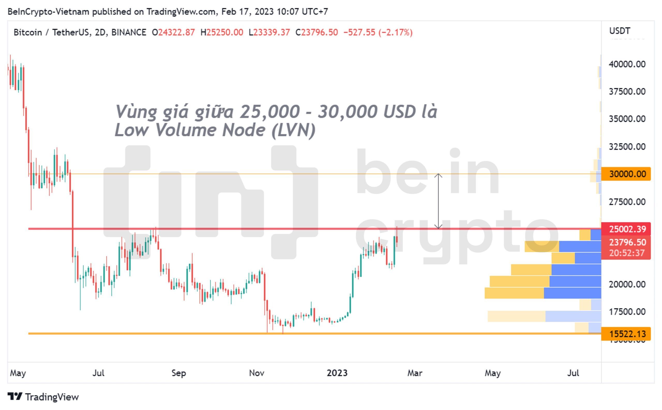 - Toàn bộ biến động giá của 9 tháng qua gói gọn trong biên độ dưới 25,000 USD. Nhưng từ trên 25,000 USD thì giá bước vào vùng Low Volume Node (LVN) – nghĩa là ít được giao dịch trong quá khứ. Vùng giá từng khiến giá BTC chững lại là quanh 30,000 USD.