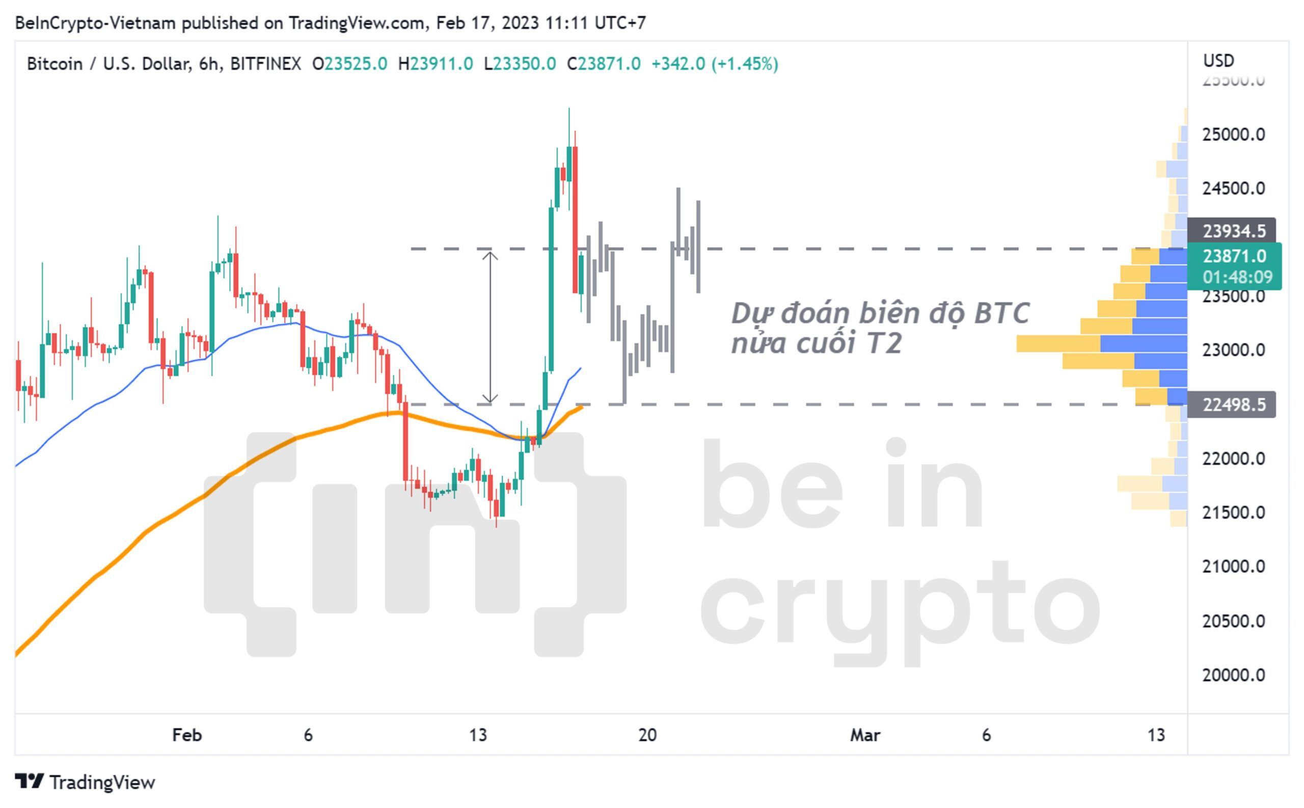 Biên độ kháng cự và hỗ trợ trên cũng có khả năng là biên độ dự đoán giá BTC nửa cuối tháng 2. Khả năng tăng đến hơn 30,000 USD sẽ phụ thuộc rất nhiều vào giá đóng cửa nến tháng 2 có vượt 25,000 USD như nói trên hay không.