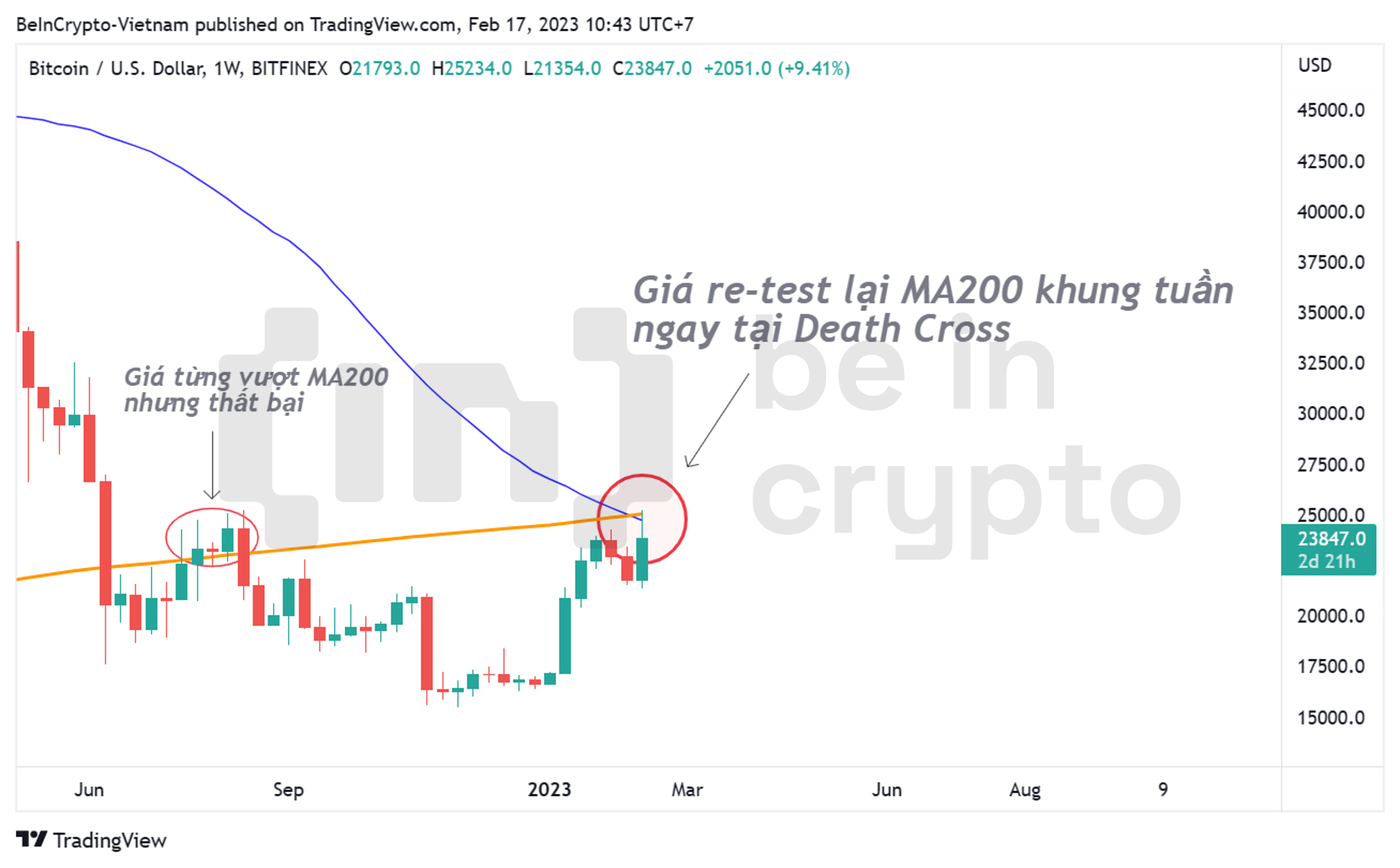 - Hành vi retest trên không đủ để khẳng định một uptrend đã bắt đầu. Nhất là khi giao cắt tử thần khung tuần đã vừa mới được xác nhận lần đầu tiên trong lịch sử giá BTC.