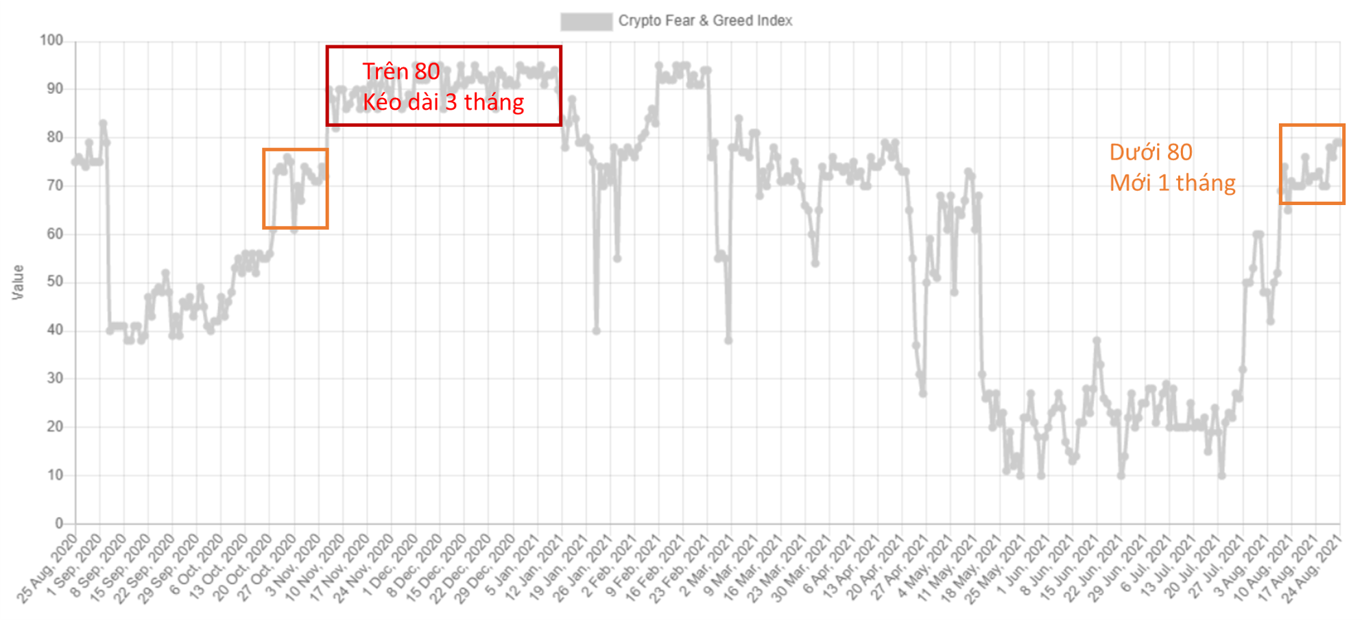 - Trong quá khứ, một cơn hưng phấn của thị trường sẽ bắt đầu bằng cách chỉ số tham lam và sợ hãi tăng lên 79 và đi quanh vùng này khoảng 1 tháng. Sau đó lên mạnh đến trên 80 đến 100 và duy trì trong hơn 1 tháng. Lần gần đây nhất là trạng thái này duy trì đến 3 tháng liền.