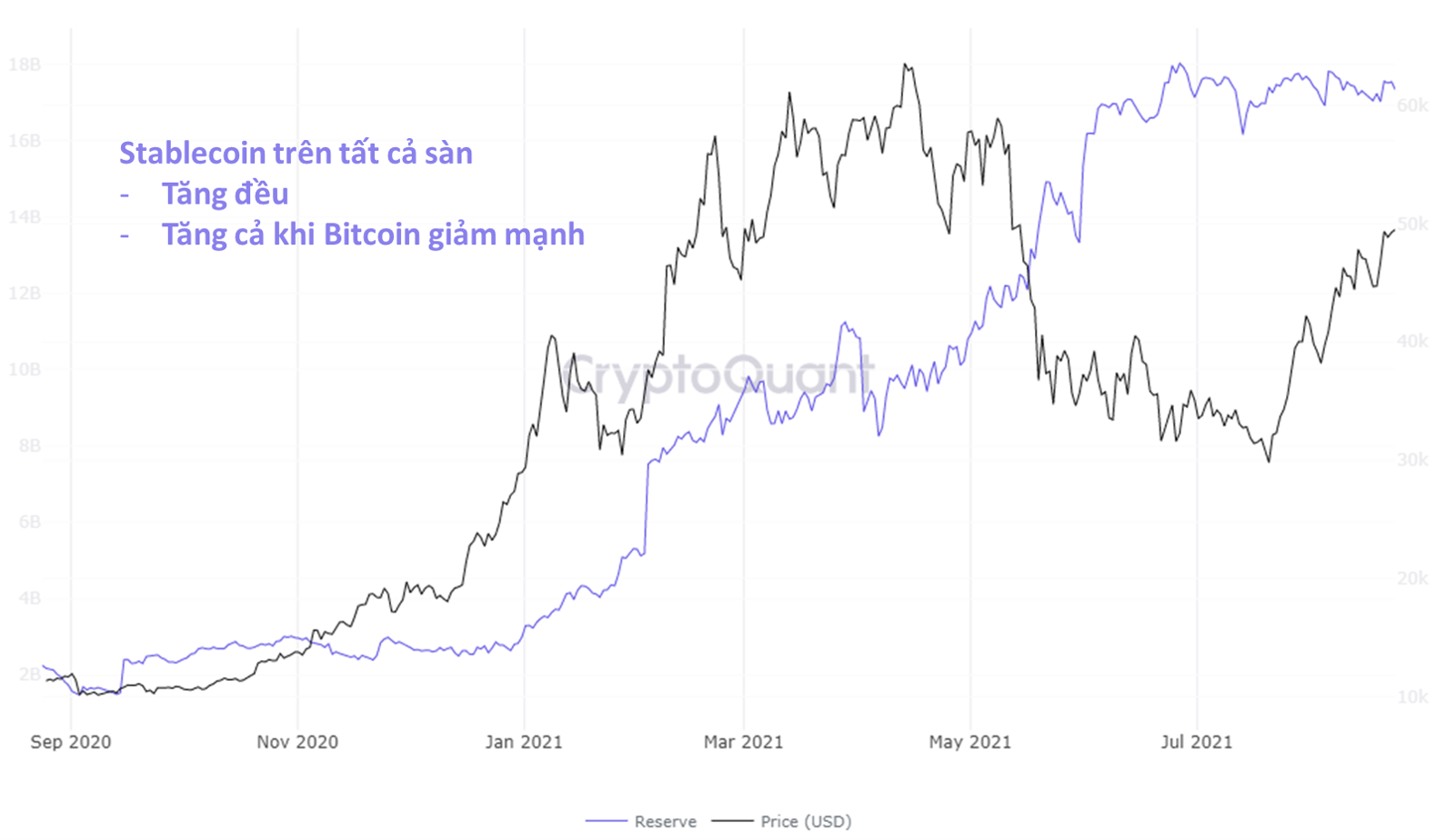 - Ngay cả khi Bitcoin giảm mạnh nhất đến 50%, thì lượng stablecoin vẫn tiếp tục lập mức ATH mới. Có thể thấy, nhu cầu mua Bitcoin 2021 là không hề suy giảm.
