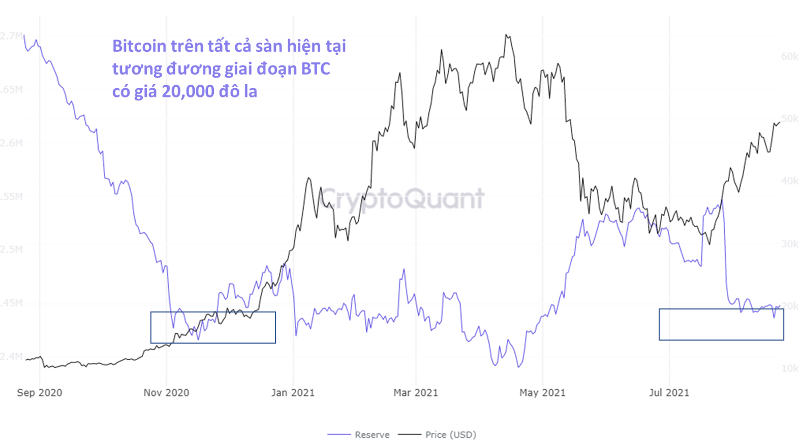 - Nhưng, kết hợp với yếu tố 1. Lượng Bitcoin trên sàn đang ở mức tương đương thời điểm Bitcoin có giá 20,000 đô. Trong khi lượng stablecoin trên sàn lại lập mức ATH.