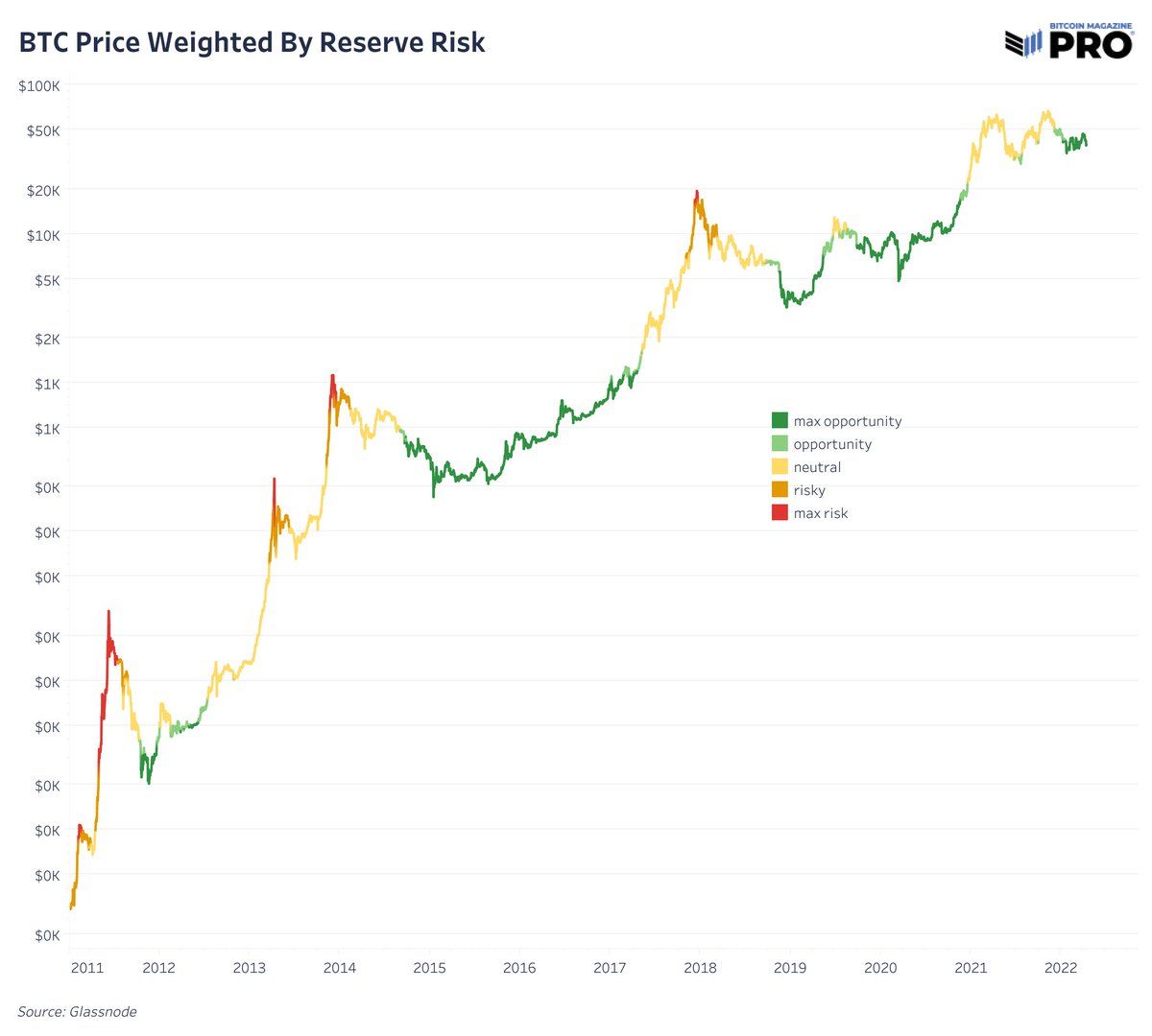 SponsoredBiểu đồ sau biểu diễn đường giá theo màu sắc thay đổi của chỉ số on-chain Reserve Risk. Chỉ số dự trữ rủi ro này đo lường mức độ tự tin của những người nắm giữ Bitcoin dài hạn so với giá Bitcoin tại một thời điểm nhất định. Họ giữ càng lâu mà bất chấp giá giảm thì chứng tỏ họ càng tự tin.