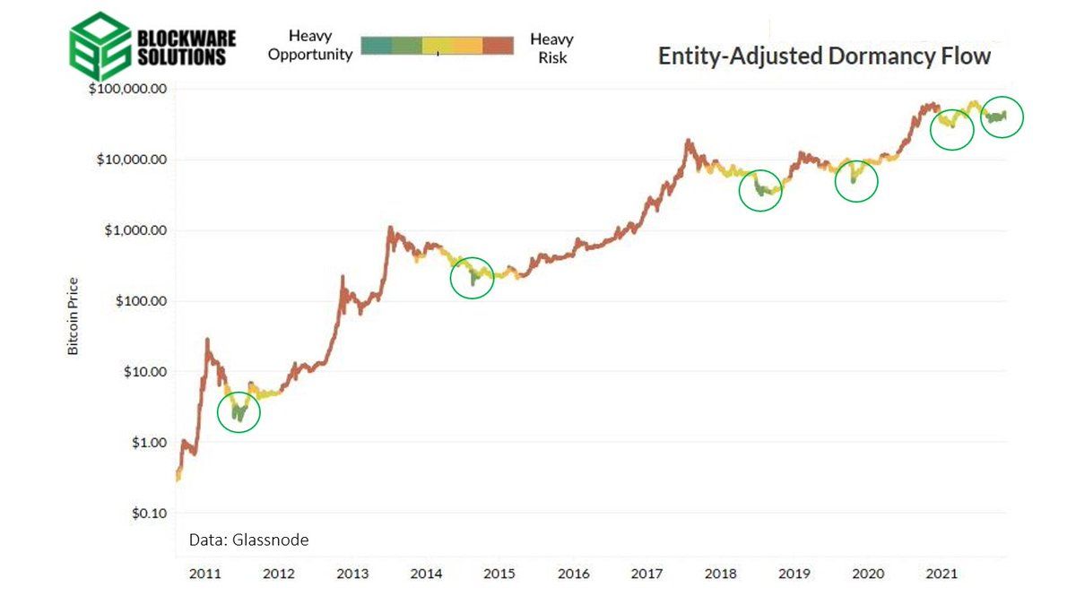 Dòng ngủ đông cũng chỉ ra đây là thời điểm cơ hội lớn để mua vào. Tín hiệu này thường xuất hiện trong khoảng thời gian không lâu, nhưng 3 tháng vừa qua nó liên tục duy trì màu xanh lá cây đậm. Thị trường dường như chỉ còn lại những Holders cứng tay mà thôi.