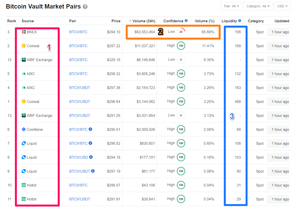 - Riêng khối lượng giao dịch lớn nhất chiếm hơn 65% thuộc về sàn BKEX thì lại có mức độ tin cậy (confidence) hạng thấp (low). Còn những sàn có độ tin cậy thuộc hạng cao (high) thì khối lượng lại cực thấp.