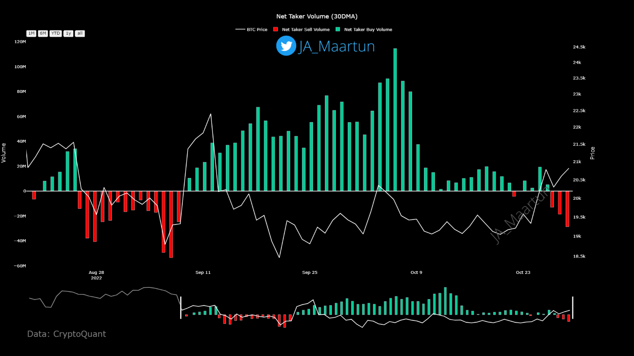 SponsoredDữ liệu từ CryptoQuant cho thấy, khối lượng của Taker Sell bắt đầu gia tăng trong hai ngày gần đây. Nếu quan sát dữ liệu giá từ tháng 8 đến nay, lần gần đây nhất khi khối lượng Taker Sell tăng mạnh là BTC giảm về dưới 20,000 USD. Lập luận này gợi ý rằng, BTC thời gian gần đây sẽ khó trụ vững ở mức giá hiện tại.