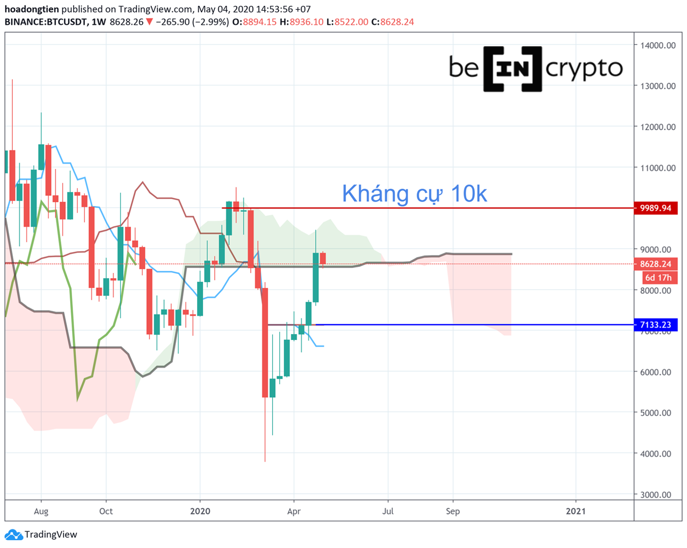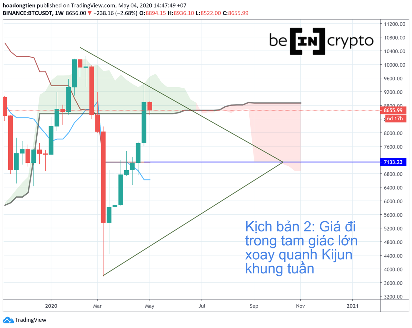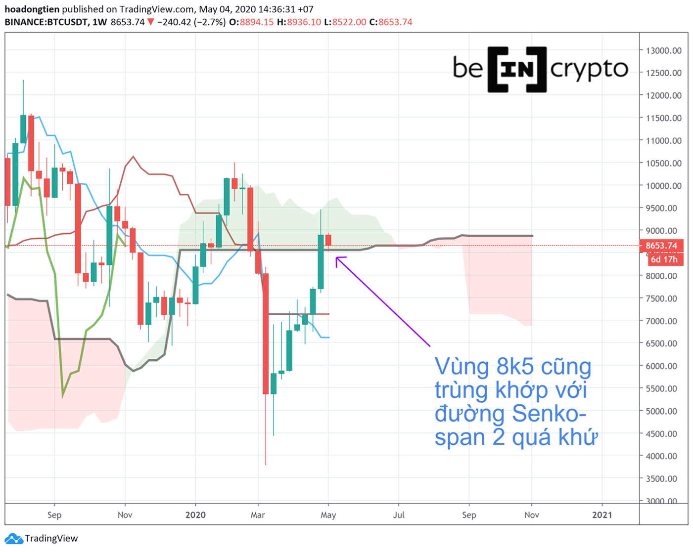 Giá cũng thường có xu hướng xoay quanh mức trung bình. Nghĩa là nếu thất bại hỗ trợ tại 8.500 đô la, nó sẽ xoay quanh mức trung bình 7.100 đô la, tức là đường Kijun của khung tuần.