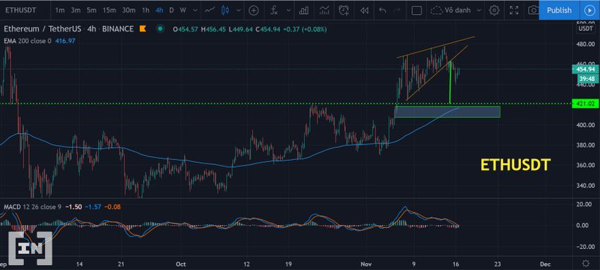 Theo biểu đồ khung thời gian 4 giờ, giá ETH đã phá vỡ mô hình nêm tăng. Sau đó, giá đảo chiều tạo xu hướng giảm tiến về ngưỡng hỗ trợ 12,400 USD. Khi đo khoảng cách chiều cao mô hình này, mục tiêu của đợt điều chỉnh vùng hỗ trợ 420 USD.