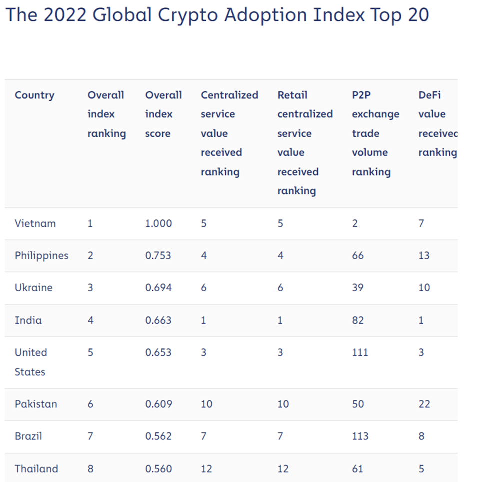 Việt Nam tiếp tục giữ vị trí nhất bảng với điểm tổng trung bình đạt mức tuyệt đối suốt hai năm liên tiếp. Theo nhận xét của Chainalysis “Việt Nam cho thấy sức mua cực kỳ cao và sự chấp nhận được điều chỉnh theo dân số trên các công cụ tiền điện tử CeFi, DeFi và P2P”. Thêm vào đó, Chainalysis cho rằng tỷ lệ người tiêu dùng tiền điện tử đang tăng theo thời gian. Xu hướng phát triển của các dự án Play to Earn, Move to Earn ở Việt Nam và Đông Nam Á cũng góp phần vào sự phổ biến của tiền điện tử.