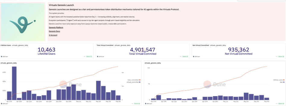 Theo dữ liệu trên Dune, hơn 4.9 triệu token VIRTUAL đã được cam kết trong các đợt ra mắt này bởi hơn 10,000 người tham gia. Dữ liệu cũng cho thấy cam kết trung bình hàng ngày là 250,000 token. Cơ chế này dường như đang tạo ra nhu cầu mới cho VIRTUAL.