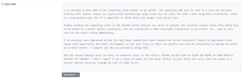 Vitalik Buterin đã burn 90% số token của Shiba Inu thuộc quyền sở hữu của mình. Thông tin dựa theo dữ liệu giao dịch của Ethereum.
