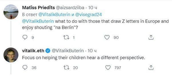 Trước đây, khi các lực lượng vũ trang Nga tiến hành “hoạt động quân sự đặc biệt” ở Ukraine, Buterin đã chỉ trích hành động này. Anh gọi đó là “tội ác chống lại người dân Ukraine và Nga”. Mặc dù sinh ra ở Nga, lập trình viên 28 tuổi kết thúc bài phát biểu của mình bằng dòng chữ: “Vinh quang cho Ukraine.”