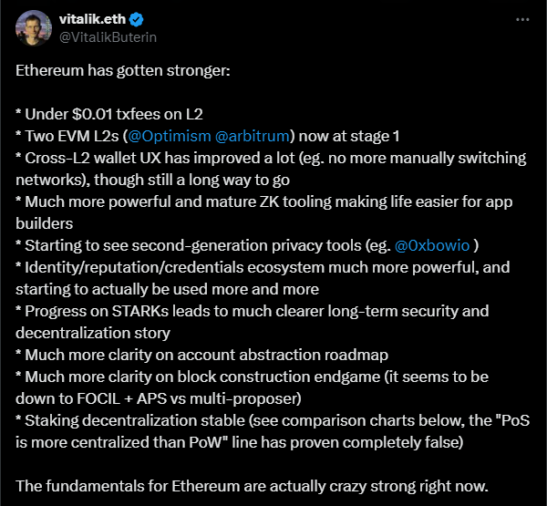 Thách thức quan điểm bi quan, Buterin tuyên bố rằng “Ethereum đã trở nên mạnh mẽ hơn.” Anh ấy đã chỉ ra các yếu tố then chốt như phí giao dịch trên các giải pháp Layer 2 giảm xuống dưới 0.01 USD và chỉ ra Arbitrum và Optimism là các Máy ảo Ethereum (EVM) hiện đang ở Giai đoạn 1. Buterin còn nói thêm rằng “nền tảng cho Ethereum hiện đang rất mạnh.”