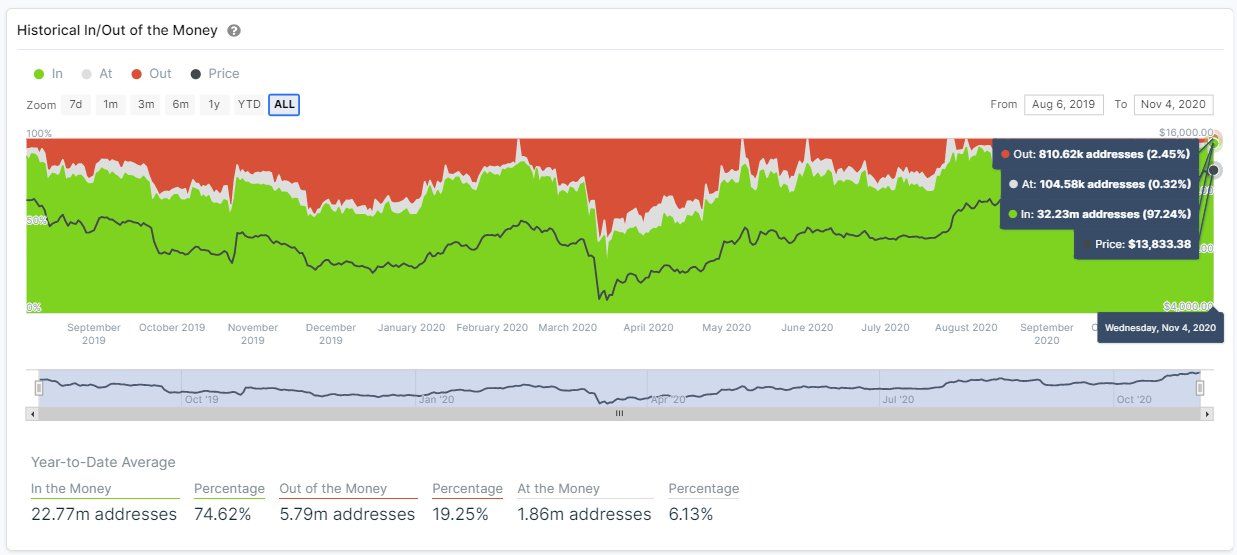 Theo chỉ số ‘Lỗ/lãi của’ của Intotheblock, khoảng 97% các nhà đầu tư đã mua Bitcoin ở bất cứ thời điểm nào trước đây sẽ đều có thể thu được lợi, nếu họ bán vào lúc này. Một số lượng lớn 32,23 triệu địa chỉ ví lưu trữ Bitcoin hiện tại khi bán ra sẽ mang lại lợi nhuận so với lúc mua vào.