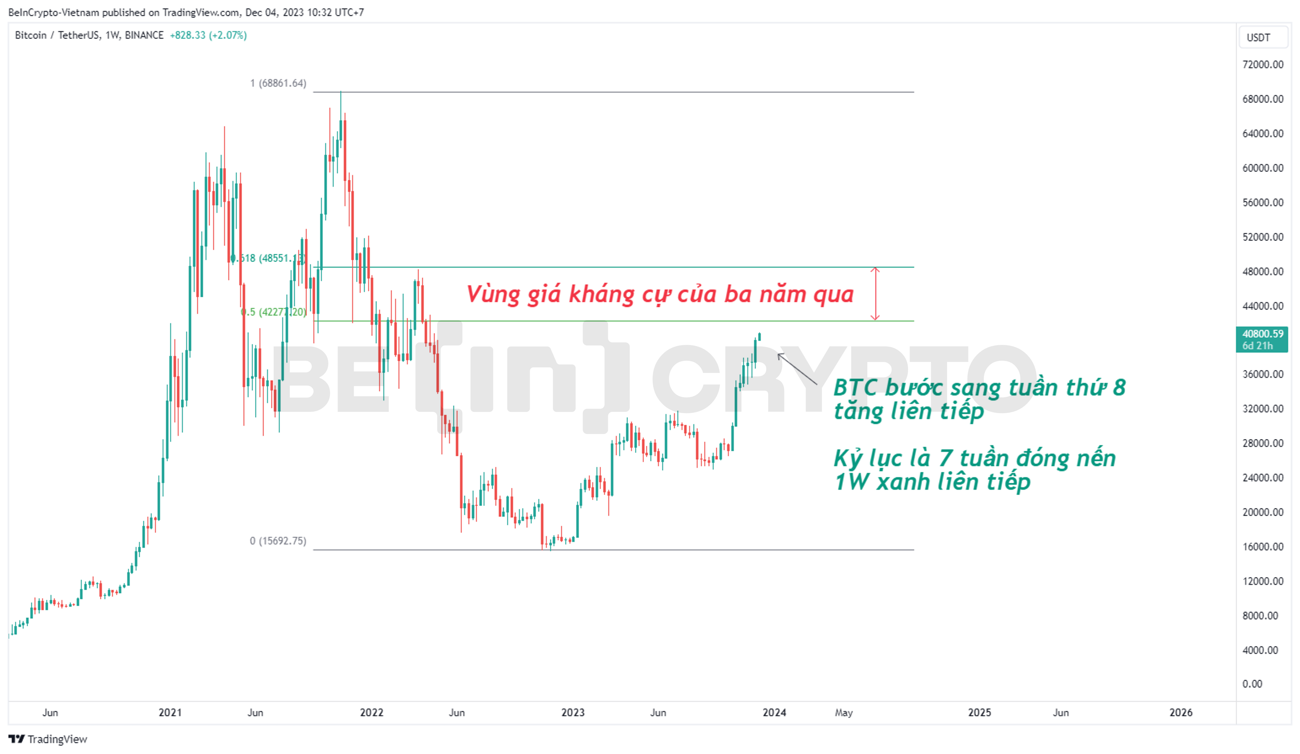 - Thước đo giá Fibonacci cũng chỉ ra vùng kháng cự trên nằm giữ Fibo 0.5 và Fibo 0.618. Từ đây, nếu BTC tăng tiếp sẽ gặp kháng cự kỹ thuật và có khả năng điều chỉnh mạnh. Trong 4 năm gần đây, 7 tuần tăng liên tiếp là kỷ lục của BTC, chưa lần nào BTC đóng nến tuần xanh thứ 8 liên tiếp.
