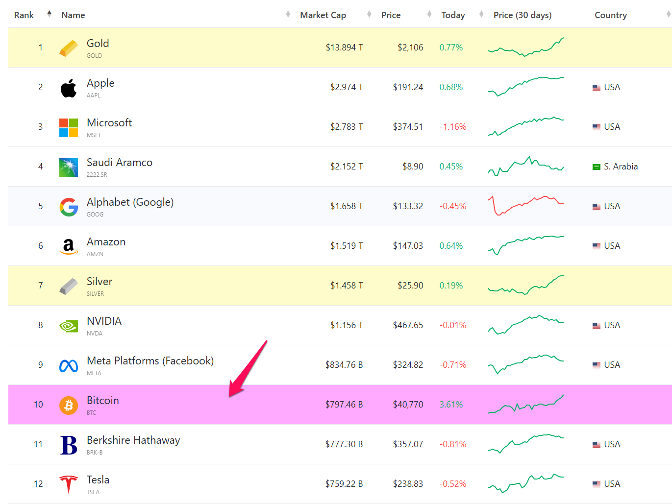 Vốn hóa Bitcoin hiện tại gần 800 tỷ USD, và nếu đà tăng này còn tiếp diễn thì có khả năng Bitcoin sẽ tiếp tục thăng hạng trong danh sách trên. Có thể thấy, danh sách trên ghi nhận màu xanh trong 30 ngày gần đây. Nghĩa là đà tăng của BTC đang nhanh hơn và mạnh hơn đà tăng của các cổ phiếu công ty hàng đầu trên.