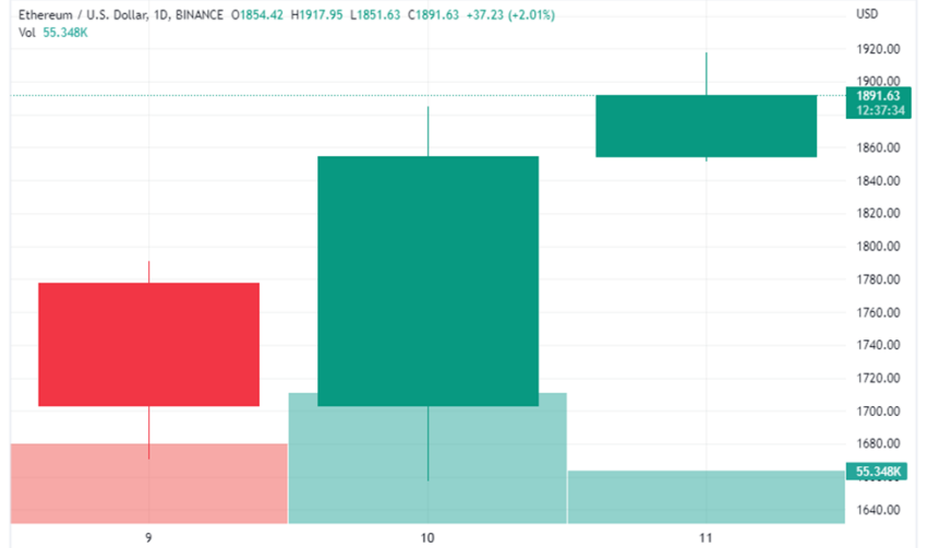 ETH đã đạt mốc 1,776.07 USD vào ngày thứ Ba và leo lên mức cao nhất trong ngày là 1,908.20 USD vào thứ Năm. Tại thời điểm viết bài, ETH đã chứng kiến khối lượng giao dịch tăng 81% trong 24 giờ qua và giá đang ở mức 1,889.28 USD. Nhìn chung, điều này tương đương với việc giá ETH tăng 6% trong vòng chưa đầy 48 giờ.