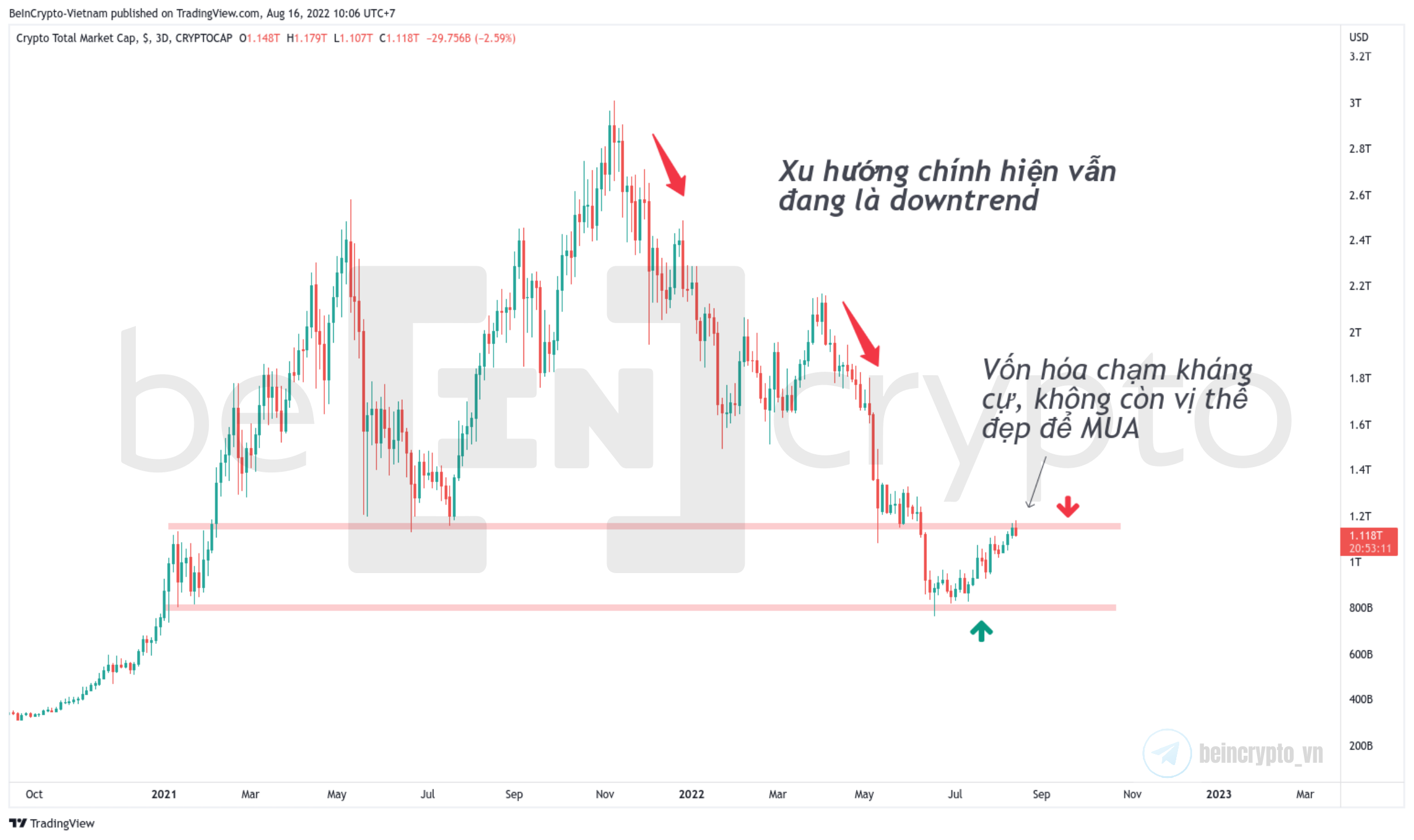 - Tín hiệu chờ đợi ở đây là một nến 3D hoặc nến 1W của biểu đồ vốn hóa, đóng cửa trên mức kháng cự. Và nếu điều này không (chưa) xảy ra thì khả năng tiếp diễn xu hướng chính (downtrend) vẫn cao hơn.