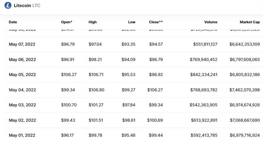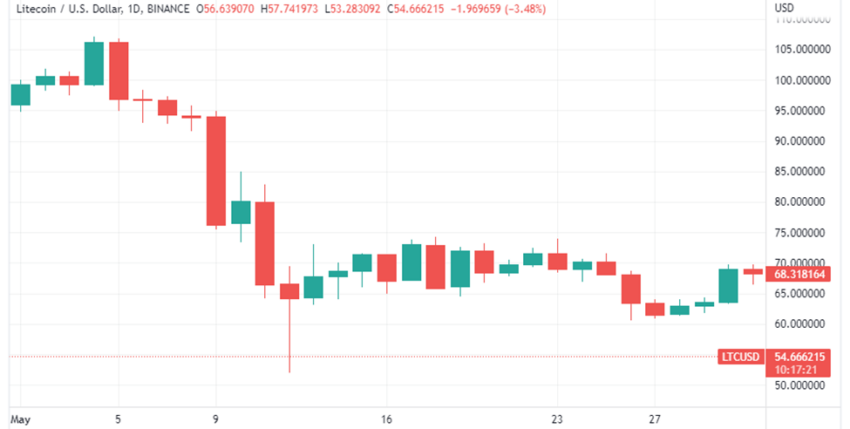 Litecoin mở cửa vào ngày 1 tháng 5, ở mức 96.17 USD, đạt mức cao hàng tháng là 106.80 USD vào ngày 4 tháng 5. Sau đó, LTC kiểm tra mức thấp hàng tháng là 55.32 USD vào ngày 12 tháng 5 và kết thúc tháng với giá giao dịch là 68.41 USD.