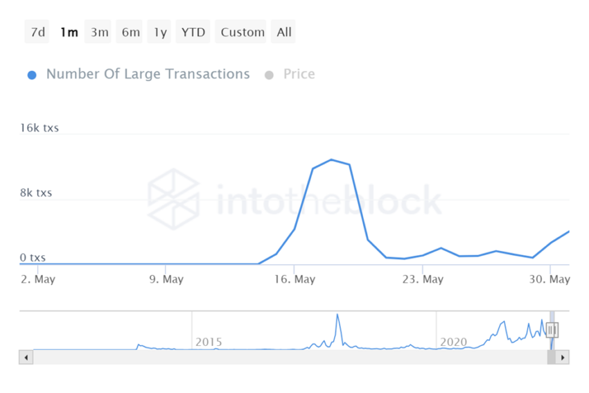 Số lượng giao dịch lớn liên quan đến Litecoin đạt mức cao nhất là 12.910 vào ngày 18 tháng 5.